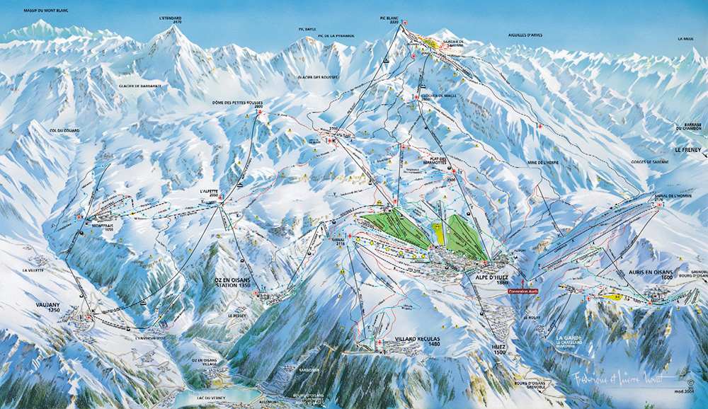 Az egyik nagy alpesi hegy az Alpe-d'Huez talán nem a legattraktívabb, de mégis nehéz itt szállást találni, mivel mindenféle képességű síelő számára megfelelő lehetőségeket nyújt, így a kezdőtől, a fekete pályák ördögéig mindenkinek ajánlható. Élénk kék ég, jó látási viszonyok és hóbiztos időjárás jellemző a tél nagy részében így Alpe-d'Huez nagy síterülete ideális kezdőknek, de kihívásokat kínál másoknak is. Az itt található nagy, modern üdülőhely körül öt kisebb, takaros falu található, amelyek a síterület központi részével összeköttetésben vannak. A kiváló síelési lehetőségek miatt, az egyik kedvenc üdülőhelynek számít, mind az 5 szektorának saját karaktere van. A síléc felcsatolását követően érdemes felmenni a felvonóval a kihívást jelentő Pic Blanc jeges területére és lecsúszni a csúcsról a völgybe a 16 km hosszú Sarenne-pályán, amely a világ leghosszabb fekete sípályája. Az Alpe d'Huez szektor tele van közepes magasságban cirkáló síelőkkel, akik egy autópálya-szélességű könnyű lesiklópályán ereszkednek le, amelyek kezdő zónának vannak jelölve. Ha ez a terület kicsit zsúfolttá válik, javasolt az egyik külső területre átmenni. Az Auris szektor például egy mini-üdülő önmagában is, és a különböző nehézségű pályák teljes skáláját nyújtja, míg Signal szektor a hegyen található, a városra néz, és kiváló siklópályái vannak és mindemellett az üdülőhelye kivilágított éjszakai síelést kínál és versenypályák is találhatóak itt. További kedvenc pályának számítanak a Vaujany/Oz szektor hosszú, védett pályái, amelyek a legalacsonyabb magasságú völgyfaluba futnak le.