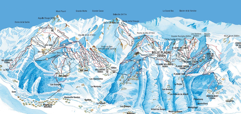 A Paradiski ultra-kényelmes nagy alpesi síterület, amely a Les Arcs és a La Plagne síközpontok összekapcsolásával jött létre, amely kiváló lehetőségeket nyújt családok részére és vegyes sí tudással rendelkező csoportok részére is. La Plagne kínálta lehetőségeket az idelátogatók vagy szeretik, vagy egyáltalán nem kedvelik, ez egy erre a célra épített magaslati üdülőhely, amelyhez négy további, távoli falu tartozik, amellyel együtt ez lett Franciaország egyik legnagyobb összefüggő síterülete, de ez csak az egyik fele a Paradiski tartománynak. Ezt a két óriási területet a megdöbbentő, emeletes Vanoise Express-felvonó kapcsolja össze, amely áthidalja a 380 m mély Ponturin-szurdokot. La Plagne a lejtős területek széles skáláját kínálja a jeges csúcsoktól, és a széles, nyílt síterületekről, a védett fás pályákig. A legnagyobb szektorok hatalmas, szűzhóval fedett síterületek, amelyek két legnagyobb bázis körül, - Plagne-Központ és a Belle-Plagne- találhatóak, a lejtők a kék és a piros, gyors pályáktól az embert próbálóbb, keskeny pályák kedvelőinek is lehetőségeket kínálnak. A legnagyobb kihívást kínáló pálya a Le Biollex szektorban található, amely off-piste lehetőségekben bővelkedik: a Bellecôte mögötti, civilizációtól messze eső területen való siklás igazi kikapcsolódást kínál.