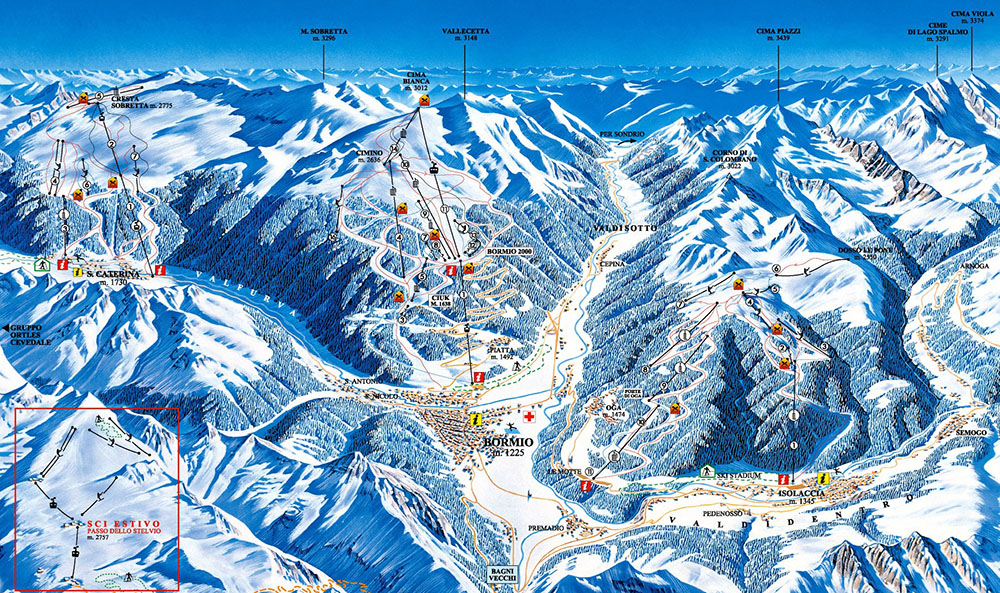 Bormio & Livigno két síközpont, amely a Stelvio Nemzeti Park mellett található. Bormio egy bájos történelmi központtal rendelkező, nagyon kicsi falu, amely körül számos, minden fajta nehézségű sípálya található. Ez az Alta Valtellina síterület része, amelynek 112 pályája van. Amellett, hogy Bormio saját sípályájával is rendelkezik (39km), a síterep összeköttetésben áll több Alta Valtellina sípályával is. Minden sípálya 2500 méter felett található, így a síelés és a snowboardozás biztosított egész szezonban. Az eredetileg termál fürdővárosnak épült Bormio síparadicsom a termálfürdőivel valamint számos bárjával, éttermével és éjszakai klubjával, valamint mozijával mára az egyik legnépszerűbb síközponttá fejlődött Olaszországban. Livigno települést olykor a Freestyle Mekkájának is nevezik, és alig néhány kilométerre nyugatra található Bormio szomszédságában. A Mottolino di Livigno Európa egyik legfényűzőbb síközpontja a híres Hóparkjával, amely mind a snowboardosok mind a síelők körében nagyon népszerű. A 2400 méter tengerszint feletti magasságban található, négy, 700 m hosszú pályája minden képességű síelő számára kiváló helyszínt biztosít. Habár Livigno nem könnyen megközelíthető, mivel nincsen autópálya vagy repülőtér a közelében, a sípályák mindig zsúfoltak és ez is azt mutatja, hogy mennyire népszerű célpont a téli sportok kedvelői körében.