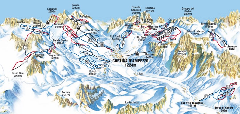 Valószínűleg az egyik legrégebbi sípálya Olaszországban, amely Olaszország egyik legnépszerűbb sípályájának számít és minden bizonnyal a legkedveltebb a híres emberek körében. Egy széles völgyben található, körülvéve gyönyörű és lenyűgöző hegyekkel. A Dolomitok királynőjének is nevezett terület talán a leglenyűgözőbb az összes síterület közül. Nem csoda, hogy az egyik legemlékezetesebb James Bond film, a Szigorúan bizalmas egyes képsorait ennek a lejtőin forgatták, valamint a Stallone szereplésével készült Függő Játszma néhány jelenetét is. Cortina d'Ampezzo az 1956-es téli olimpiai játékok helyszíne volt, valamint az 1927-ben, és 1941- ben megrendezett Nordic versenyeknek valamint az 1941-es Skandináv és Alpesi Sí Világbajnokságnak is helyet adott. Cortina jól ismert a síterületeiről, a tájairól, a szálláshelyeiről, üzleteiről és a síelés utáni kikapcsolódási lehetőségeiről, valamint a hely világhírű légkörével is csábítja az idelátogatókat. Délután, az emberek szeretnek kirakatokat nézegetni vagy bámészkodni Corso Italia utcán, amely Cortina főútja. Ezen a sétálóutcán a legdivatosabb üzletek, szállodák, éttermek és kávézók találhatóak. Öt síterep alkotja Cortina síterületét, a nagyszerű, hosszú sípályáktól a Világkupa lesiklópályájáig minden megtalálható. Cortinába és Alta Badia síterület között buszkapcsolat is van. A sífutás rajongói részére a Fiames Sport Nordic Központ nyújt lehetőségeket, azonban az üdülőhely a curling, a snowkite (ernyővel síelés) és az extrém téli sportokra is lehetőséget ad. Az új trend Cortinában az úgynevezett lassú síelés, amely egy új (vagy rég elfeledett) módját kínálja a síelésnek, ami tulajdonképpen arról szól, hogy az időt jól kihasználva legyen a síelés igazi élmény az idelátogatóknak. Ennek a tapasztalatnak a megszerzéséhez Faloria kiváló helyszínt kínál, amelynek az egyik legfestőibb lejtője - a Vitelli-lesiklópálya - a lassú síeléshez.