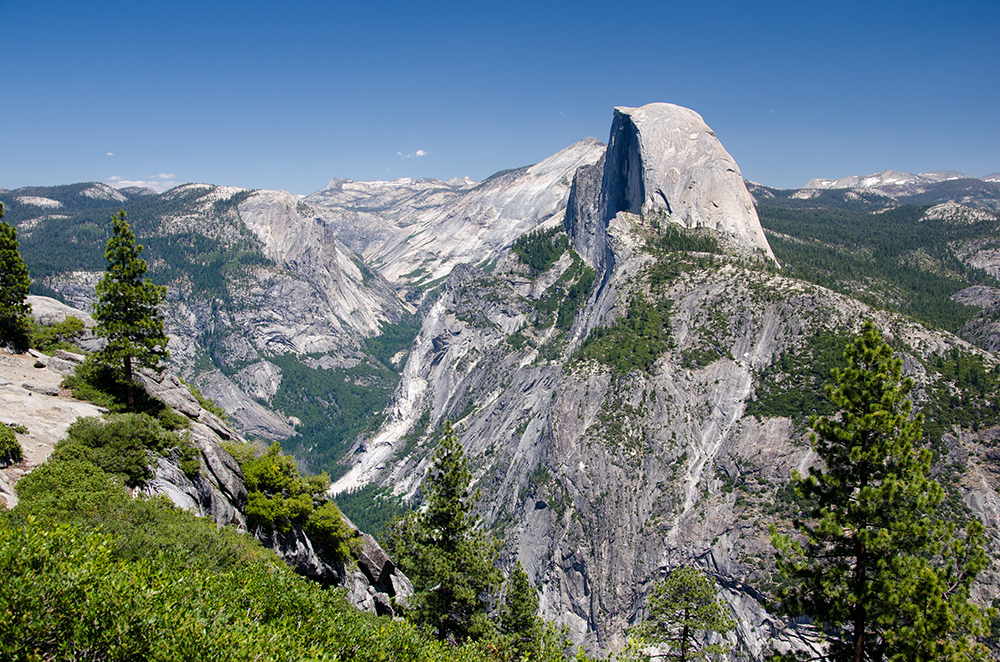 Yosemite legelismertebb geológiai látványossága, Half Dome, vagyis Fél Kupola-csúcs, amelynek majdnem függőleges északi felszíne a sziklamászókat már több mint egy évszázada csábítja, de a bátor túrázók Yosemite-völgyből is felérhetnek a csúcsra egy hosszú és fáradságos út végén. A nyomvonal utolsó részén két kábelkapaszkodóval ellátott ösvény mentén vezet az út, amelyek a meredek emelkedéshez támogatást nyújtanak. Azon látogatók számára, akik az egész napos vándorlást nem találják szórakoztatónak, a völgy tucatnyi pontjáról és park kilátóhelyéről gyönyörű kilátás nyílik a park leghíresebb látnivalóira, így a Half Dome-ra is.